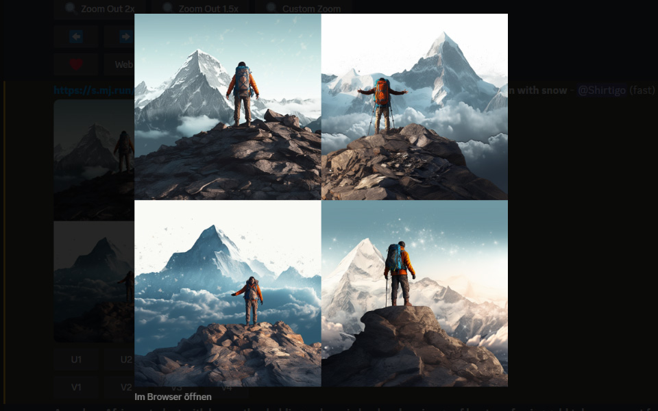 Alternativ zu einer reinen Texteingabe kannst du die KI auch ganz einfach auf Basis eines anderen Bildes arbeiten lassen. Dazu kopierst du die Web-URL des Basis-Bildes in den Prompt und sagst dem Bildgenerator anschließend, wie er das Bild weiterbearbeiten soll. Wichtig: Achte darauf, dass du keine Urheberrechte verletzt, wenn du mit anderen Bildern arbeitest! Dein Ergebnis sollte sich stark vom Ausgansmaterial unterscheiden. Als Beipiel haben wir die URL eines freigestellten Bergsteigers eingefügt und anschließend folgenden Prompt dahinter eingegeben: "https://s.mj.run/BRaignJLDgw mountaineer standing in the front, in the background a mountain with snow". Auf Basis dieser Eingaben, hat uns Midjourney die unten gezeigten Varianten erstellt.